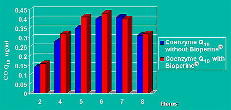 This graph shows the amount of CoQ10 going to the blood after a single oral intake of 90 mg CoQ10 and 5 mg of Bioperine.