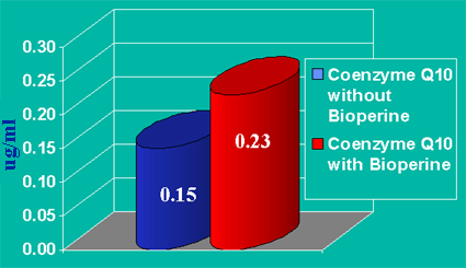 And the following graph shows the absolute change in serum CoQ10 after 14 days of supplementation with CoQ10 (90 mg daily) and Bioperine (5mg daily).