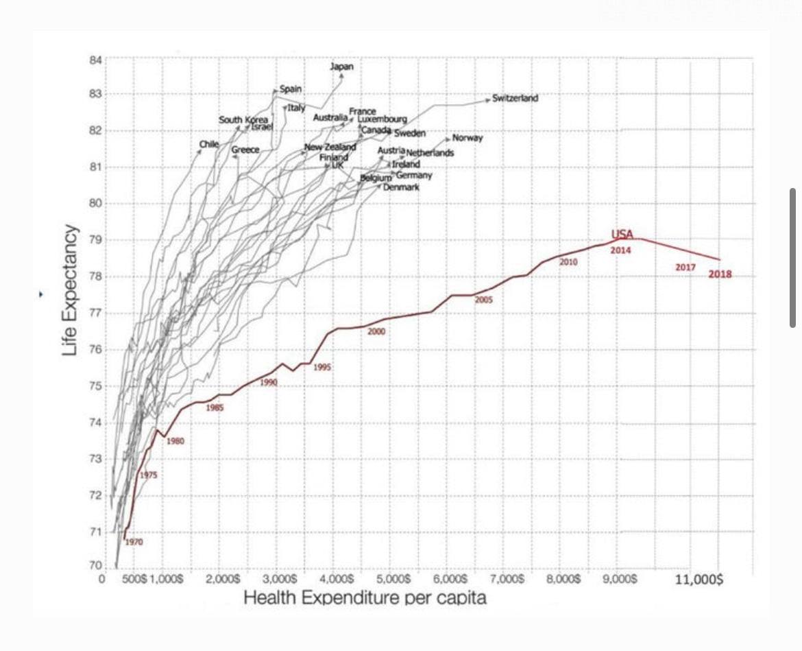 life expectancy versus expenditureUnited States health statistics as shown in this graph (click to enlarge) make one thing clear: